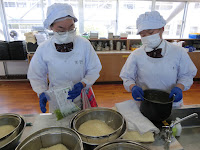 時間内に美味しそうなお弁当を作り終えることができて、ほっとしました。献立は、「枝豆ご飯、カレー風味の生姜焼き、和風春雨サラダ、トマトとツナの塩昆布和え、キウイ」です。初めて行う大量調理で使う大量の野菜や調味料に驚きながら、作業を進めました。